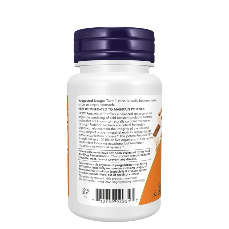 Probiotic-10™ 100 Billion de Now Foods est une formule probiotique hautement concentrée conçue pour restaurer et maintenir un équilibre intestinal optimal. Chaque capsule végétarienne contient 100 milliards d’unités formant colonies (UFC) issues de 10 souches bénéfiques, sélectionnées pour leur stabilité et leur efficacité clinique. Ce complément aide à renforcer la flore intestinale, améliore la digestion des nutriments et favorise une meilleure assimilation. Il est idéal après une cure d’antibiotiques, en période de stress ou lors de troubles digestifs.